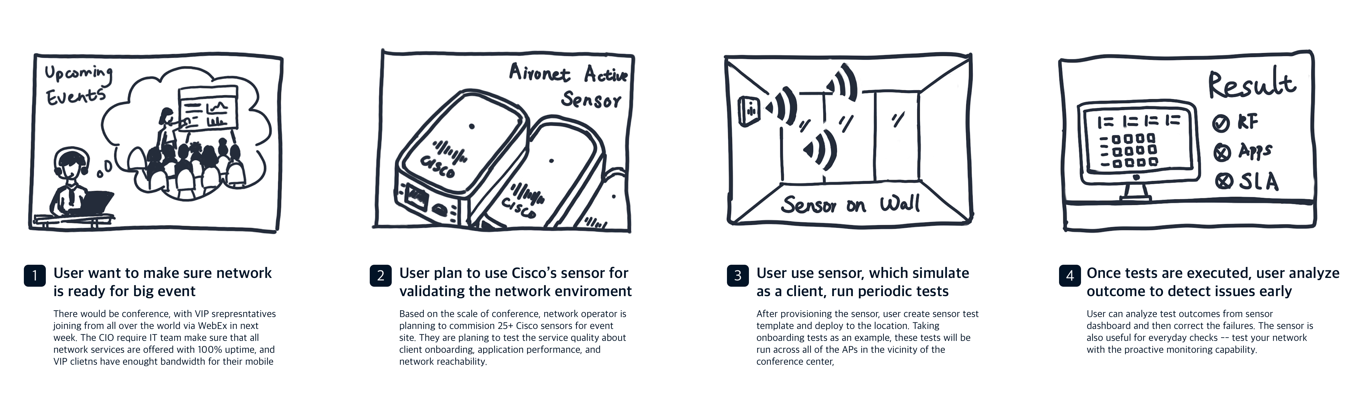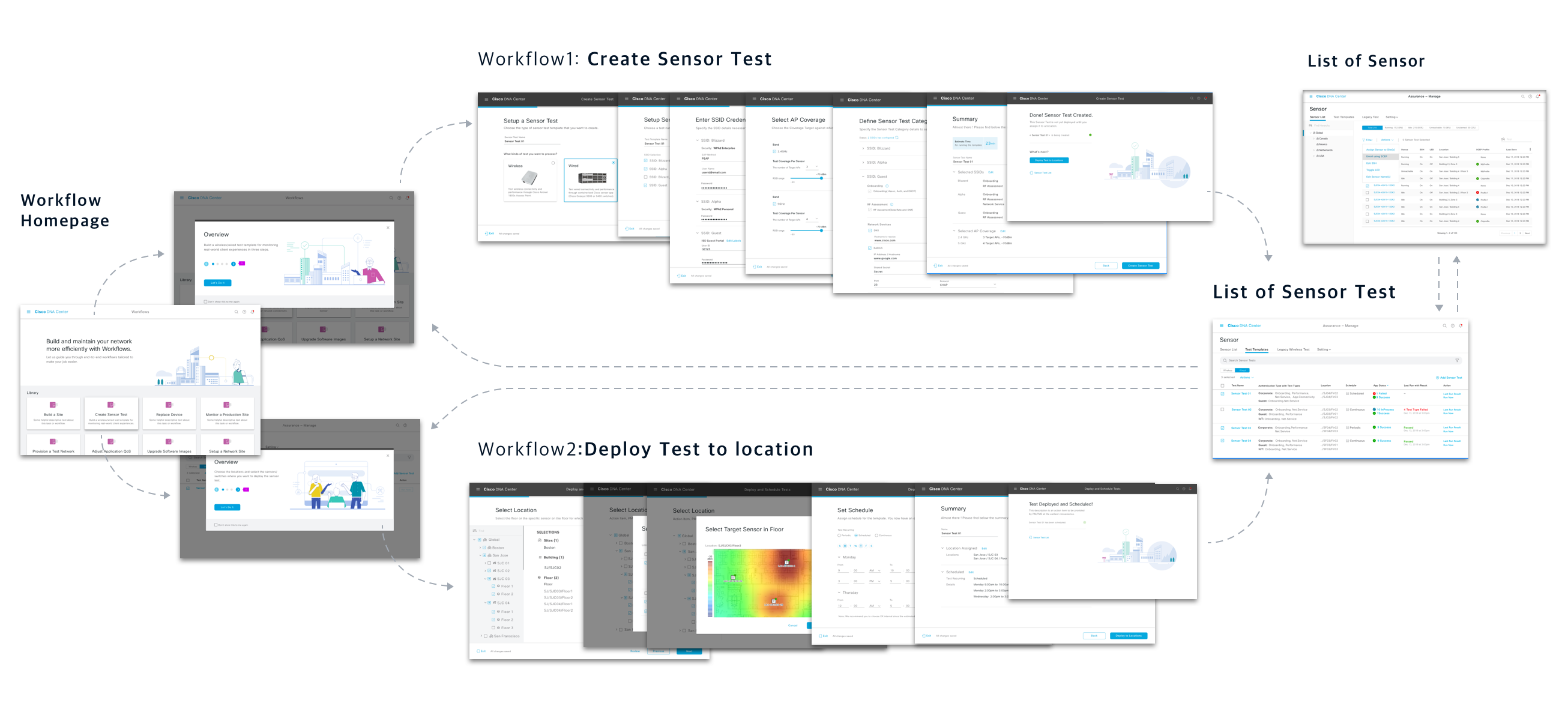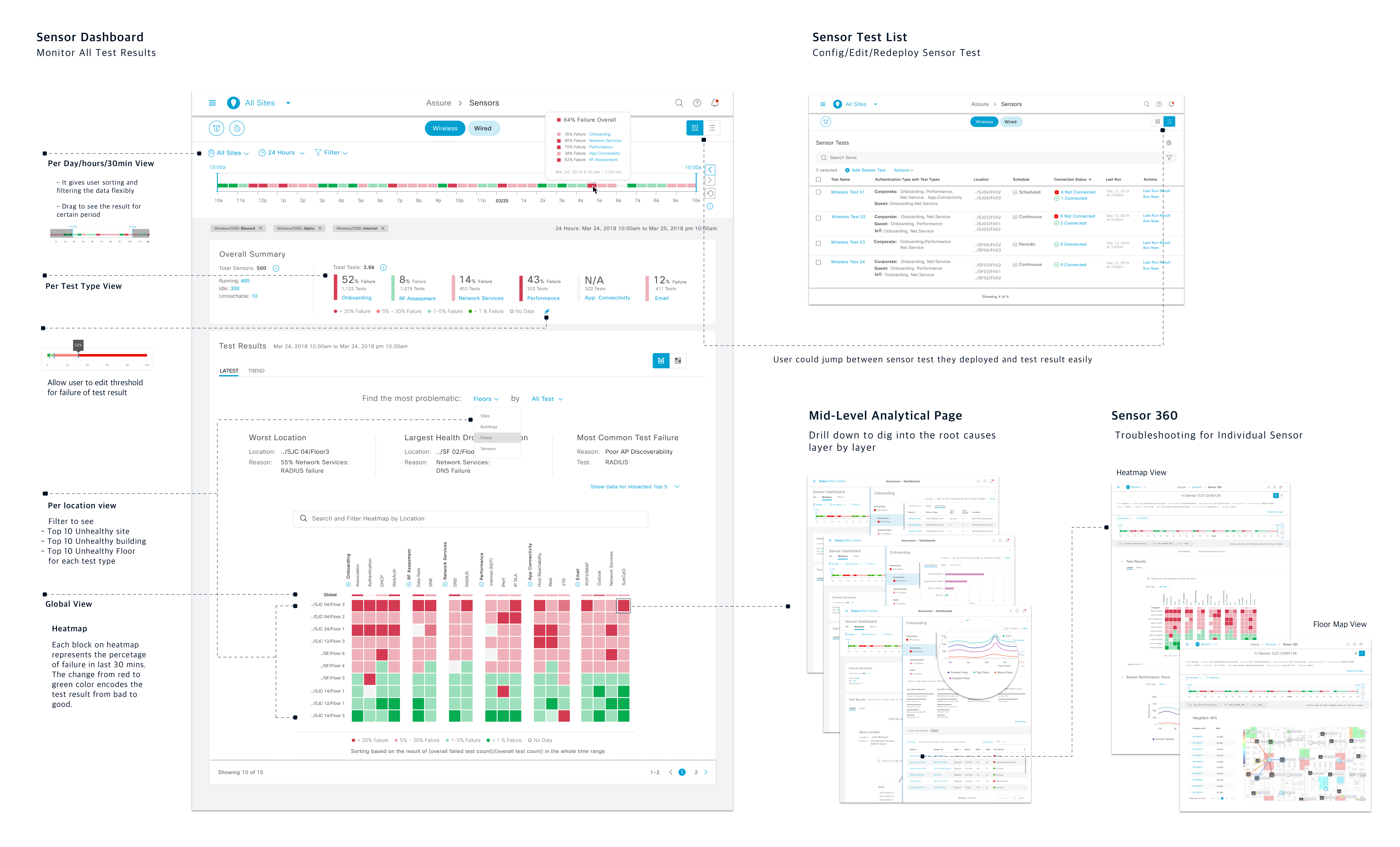 I drew the overview flow based on my understanding of the ecosystem. This end-to-end view shows how users go from initially mounting the physical sensors in the office to running the wireless test on Cisco DNAC. It helps me to create an intuitive, cohesive and seamless user experience across all phases.