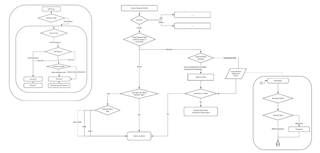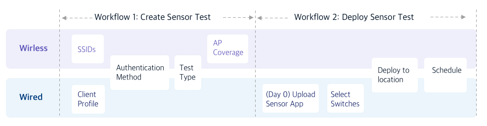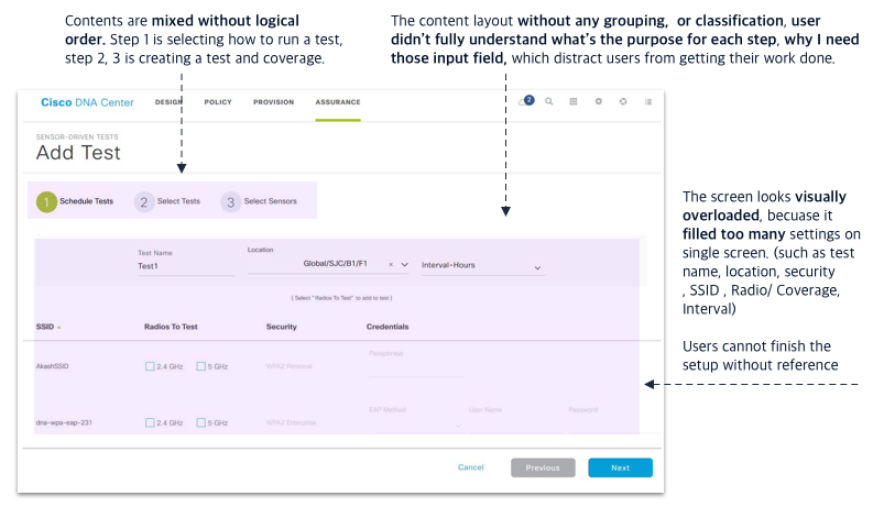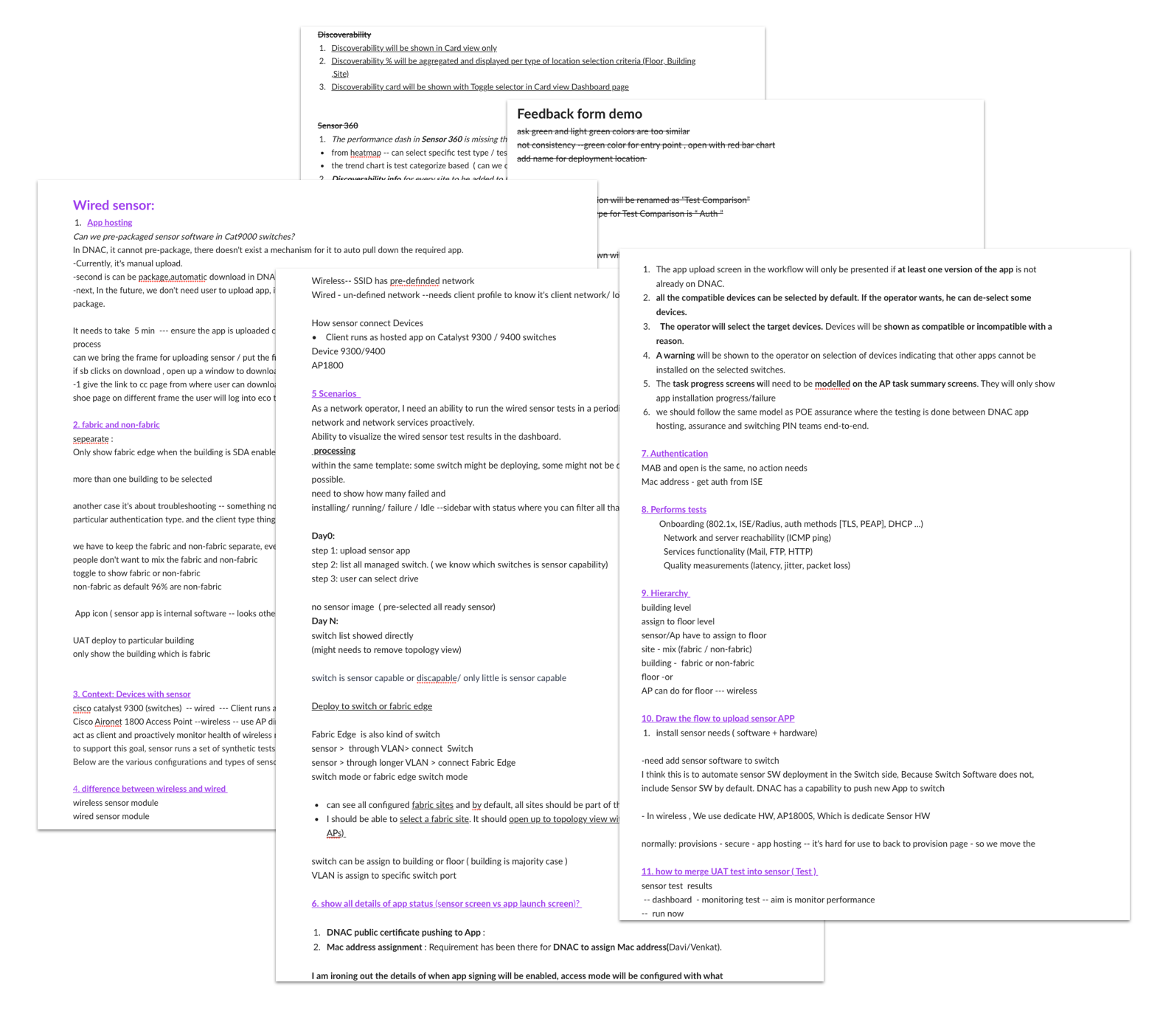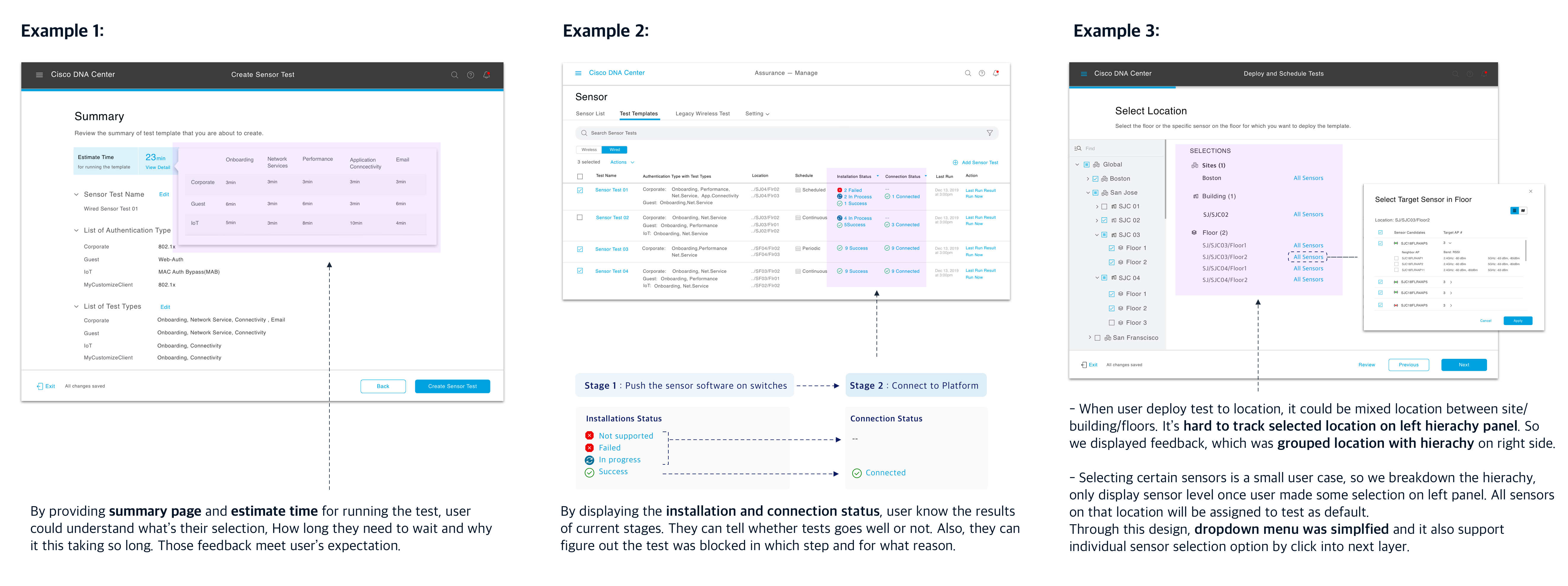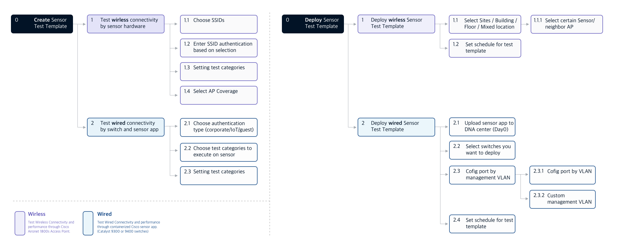 I drew the overview flow based on my understanding of the ecosystem. This end-to-end view shows how users go from initially mounting the physical sensors in the office to running the wireless test on Cisco DNAC. It helps me to create an intuitive, cohesive and seamless user experience across all phases.