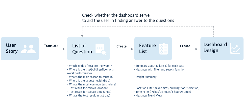 Because the data visualization dashboard is for discovery and insight purposes, the user flow is not a linear journey but a branching journey. (because many actions can be taken, such as filter/toggle/click on the chart.) So I translate the user story into a list of questions and see whether the design could solve all questions.
