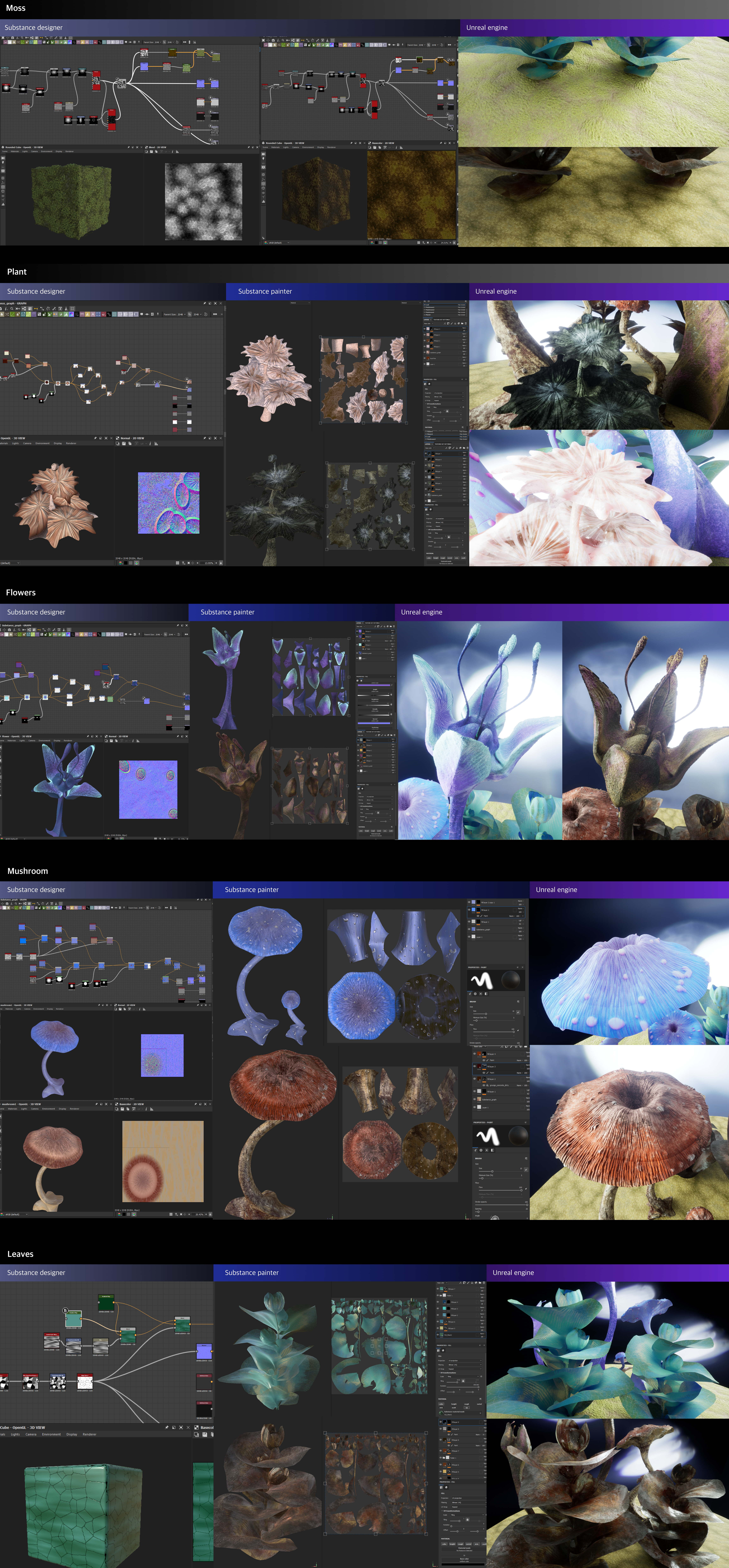 For example, Substance Designer was used primarily for creating materials with clear, repetitive patterns. For more complex materials like plants, which require detailed and varied textures, Substance Painter provided greater control and flexibility.