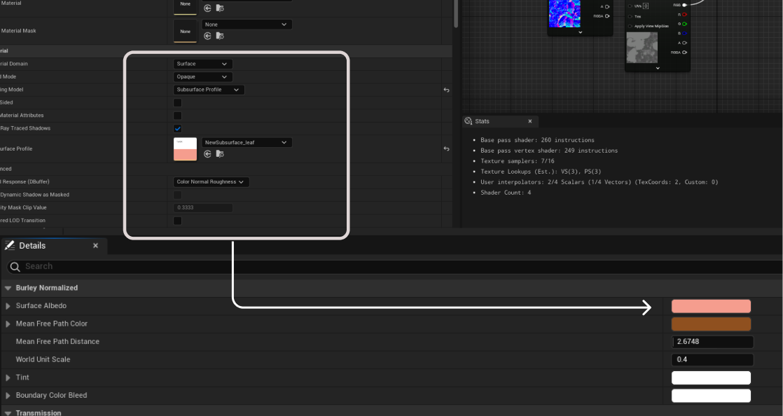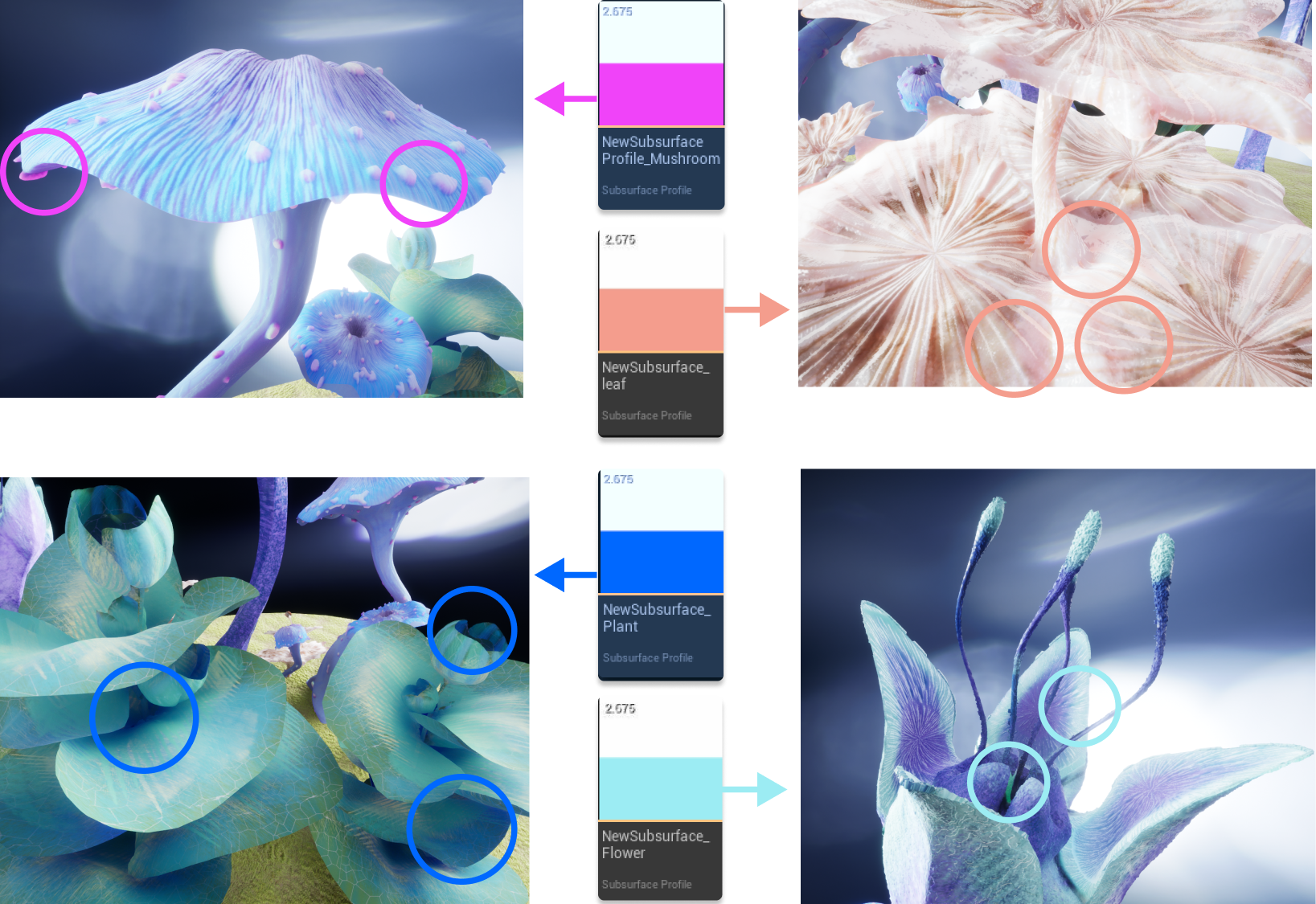 To further enhance the realism of my materials in Unreal Engine 5, I utilized subsurface profiles. Subsurface profiles are essential for achieving accurate subsurface scattering effects in real-time rendering. I chose colors that matched the look of the alien plants, which was ideal for the fleshy look of the plants.