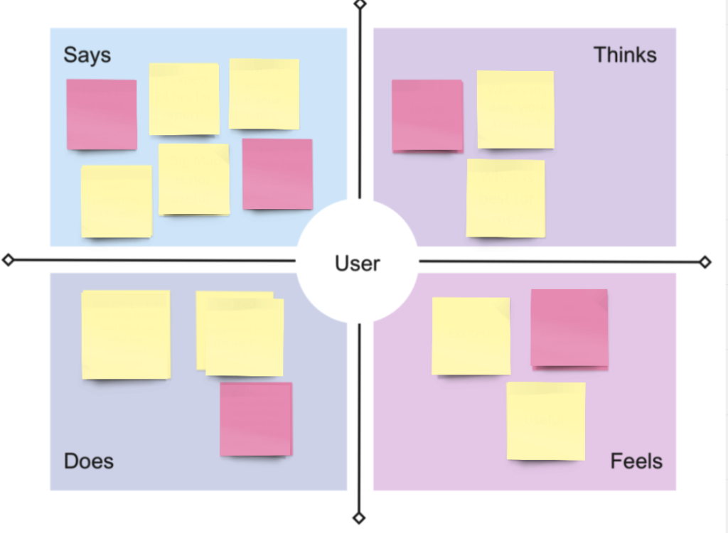 In order to advocate on behalf of the user, the UX designer visualizes user attitudes and behaviors in an empathy map to understand the end-users and prioritize their needs.